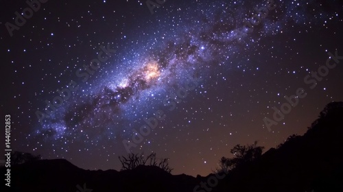A starry night sky with a long, thin cloud of gas and dust called a nebula
