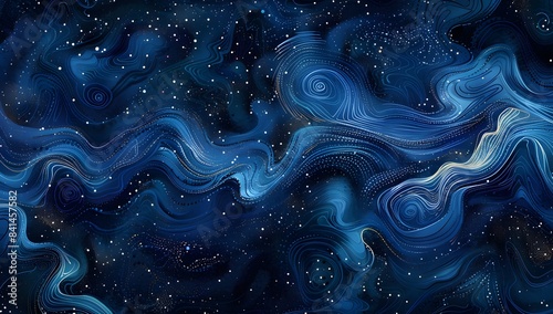 A starry night sky with swirling patterns of dots and lines in shades of blue, creating an abstract representation of the cosmos