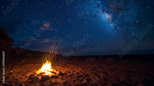 A starry night view of the Milky Way arching over the ancient sandstone formations in Arches National Park, Utah.