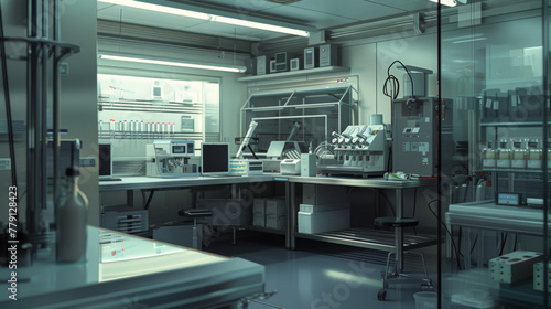 A state-of-the-art biotech analytical testing laboratory with advanced analytical instruments and validation equipment, momentarily unoccupied but ready to analyze biologic samples for quality control