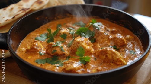 A steaming bowl of Chicken Tikka Masala with tender chicken pieces in a rich, creamy sauce, garnished with fresh cilantro and served with naan bread.
