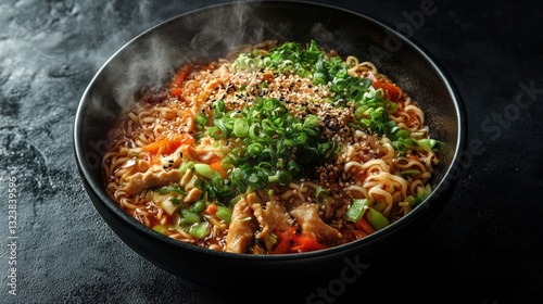 a steaming bowl of delicious noodles with vegetables, a perfect culinary creation. The bowl sits on a dark background, highlighting the vibrant colors and textures of the dish.