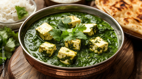 A steaming bowl of Indian Palak Paneer with creamy spinach and paneer cubes garnished with cilantro served with naan bread and a side of basmati rice on a wooden board