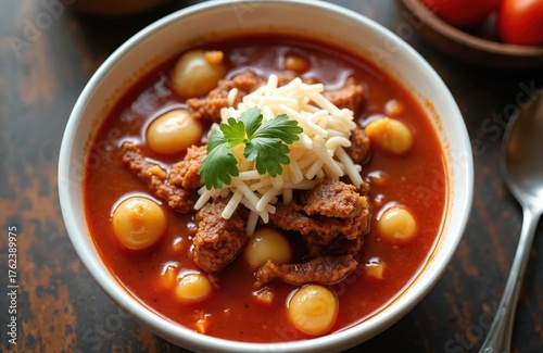 A steaming bowl of menudo soup, filled with tender meat, hominy and garnished with shredded cheese and fresh parsley. The rich red broth and hearty ingredients promise a delicious and satisfying meal.