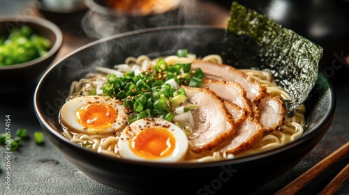 A steaming bowl of ramen noodles with soft-boiled egg, sliced pork, and green onions, garnished with nori in a rustic setting.