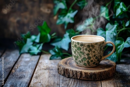 A steaming coffee mug on a rustic wood plank, backed by ivy leaves