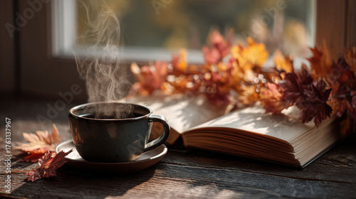 A steaming cup of coffee beside an open book adorned with autumn leaves by a window