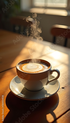 A steaming cup of coffee placed on a wooden table with morning sunlight.