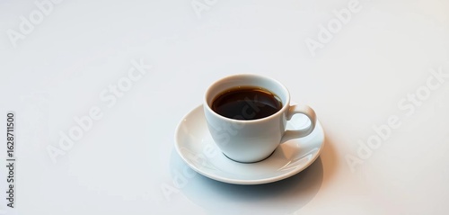 A steaming cup of coffee rests on a small, pristine white saucer, saucer, ceramic