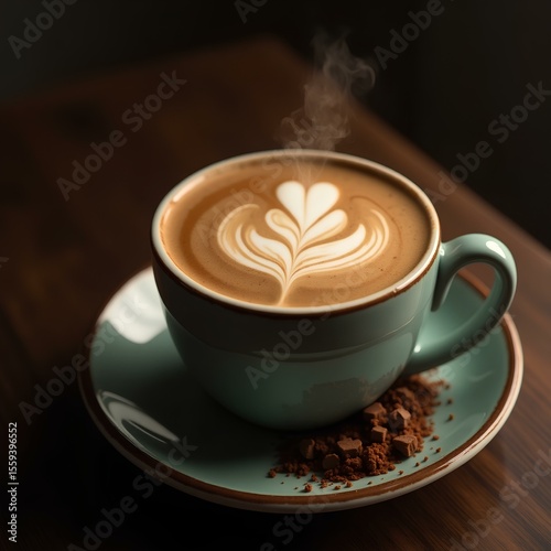 A steaming cup of coffee with latte art on wooden table