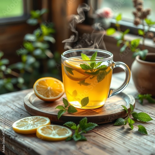A Steaming Cup of Mint and Lemon Tea in a Garden Glow