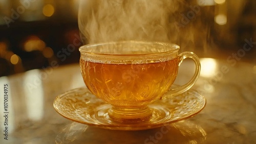 A Steaming Cup of Tea on a Saucer with Golden Background