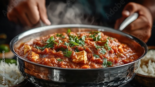 A steaming curry dish garnished with fresh herbs, inviting and aromatic, it captures the essence of comfort food and the joy of communal dining experiences.