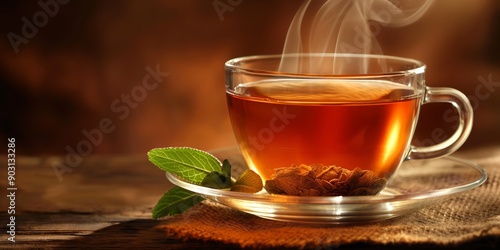 A steaming glass cup of tea with mint leaves on a saucer on a wooden surface, creating a warm and cozy ambiance.