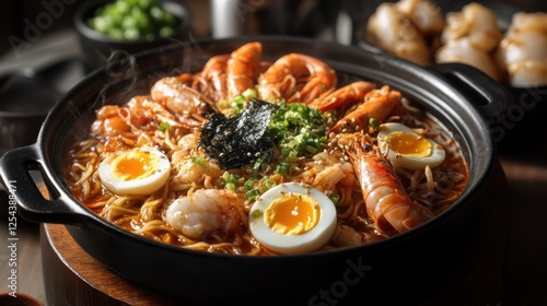 A steaming hot seafood ramen bowl with rich, flavorful broth, topped with shrimp, crab legs, scallops, and soft-boiled eggs.