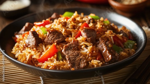 A steaming plate of beef fried rice with crispy garlic chips, bell peppers, and glossy soy glaze on a bamboo mat