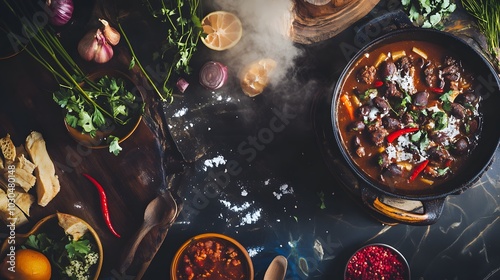 A steaming pot of feijoada, a traditional Brazilian dish, is surrounded by fresh ingredients.
