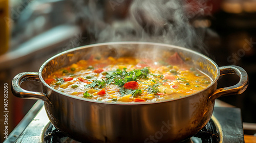 A steaming pot of hearty vegetable soup simmers on a rustic stove, symbolizing warmth, nourishment, and comfort, with soft lighting and blank caption space on the side for text placement.