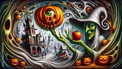 A steampunk-inspired haunted house with gears and pipes, approached by trick-or-treaters in Victorian costumes with goggles. A witch in a top hat holds a wrench near a glowing, steam-powered jack-o'-l