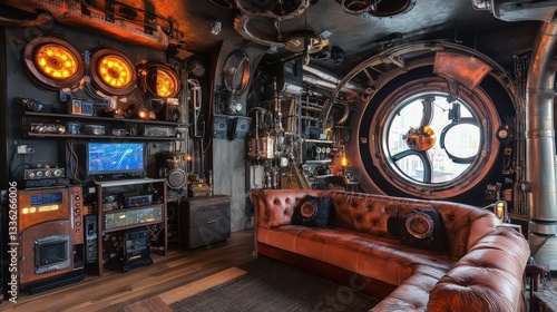 A steampunk-style home where gears and glowing electric tubes power everyday life.