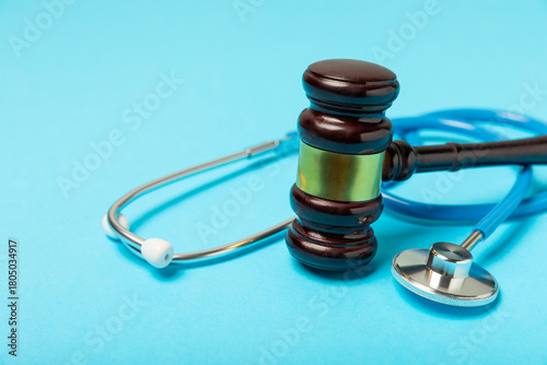 A stethoscope and hammer on a desk. Medical malpractice, personal injury lawyer, and healthcare legal aspects concept.Lawyer.Legal definition of medical negligence. Law concept.Healthcare and Medicine
