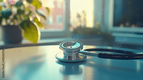 A stethoscope is on a table in front of a window