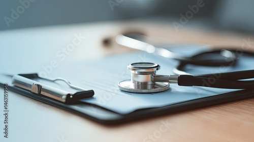 A stethoscope rests on a clipboard, symbolizing healthcare and medical practice.