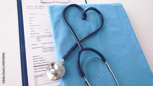 A stethoscope shaping a heart on a medical uniform, closeup
