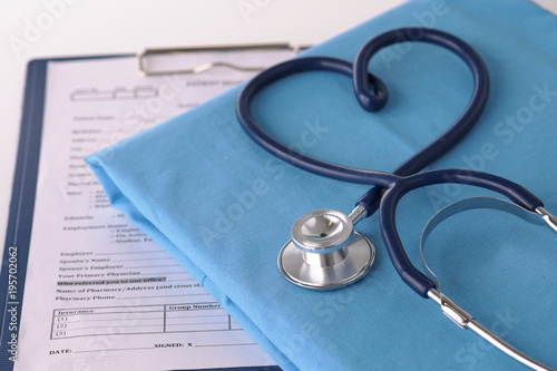 A stethoscope shaping a heart on a medical uniform, closeup