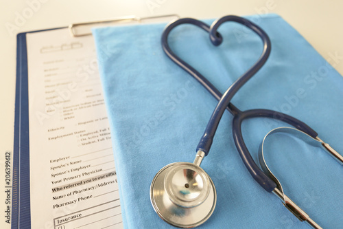 A stethoscope shaping a heart on a medical uniform, closeup, selective focus