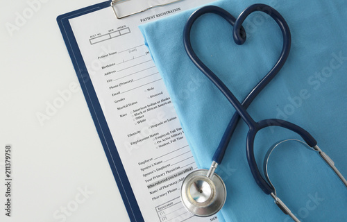 A stethoscope shaping a heart on a medical uniform, closeup, selective focus