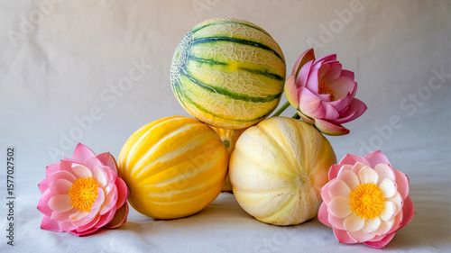 A still life photograph of three cantaloupe melons arranged in a pyramid formation against a plain light gray background.