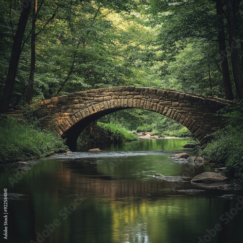 A stone bridge crossing a river in a dense forest, surrounded by greenery and natural beauty
