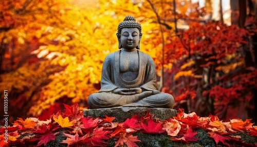 A stone statue of a Buddha, is surrounded by the colorful leaves.