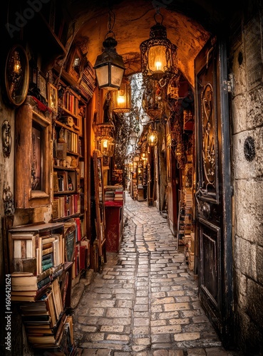 A stone-paved alley, lined with bookshelves and antique decor