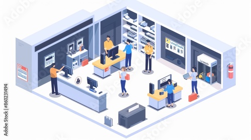 A store with people shopping and a fire extinguisher on the wall