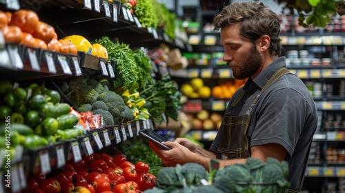 A store worker using a tablet to manage and check the inventory of fresh vegetables and fruits displayed on shelves, ensuring proper stock levels and quality control.