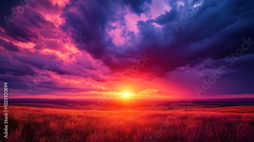 A stormy sunset over a vast open landscape, with dark clouds covering part of the sky and the setting sun casting a warm orange glow across the horizon.