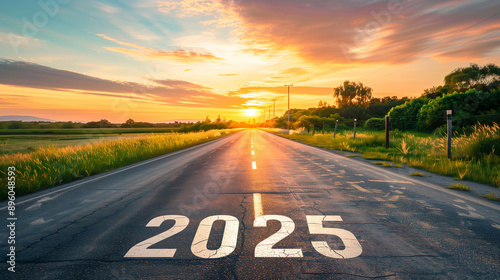 A straight desert road marked with the number 2025, extending into the horizon with the sun rising, symbolizing the journey and anticipation for the year 2025.