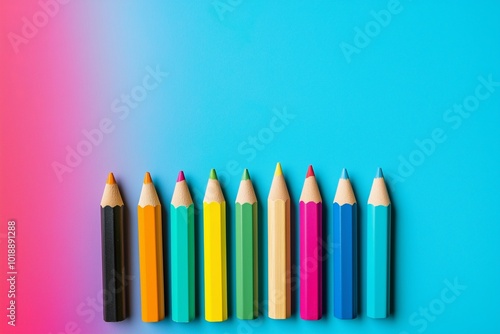 A straight row of colorful pencils showcases a gradient transition from red to blue on a sleek background surface.