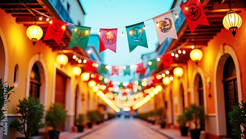 A street adorned with hanging Mexican flags, paper lanterns, and string lights glowing in the evening, creating a festive and warm ambiance