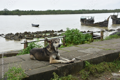A street dog rests by the Bakkhali River with old boats in the background.