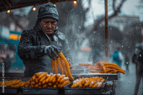 A street vendor in a Spanish plaza prepares churros, a traditional Spanish fried dough pastry, for customers in the snowy weather