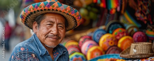 A street vendor proudly presenting a display of colorful handcrafted goods.