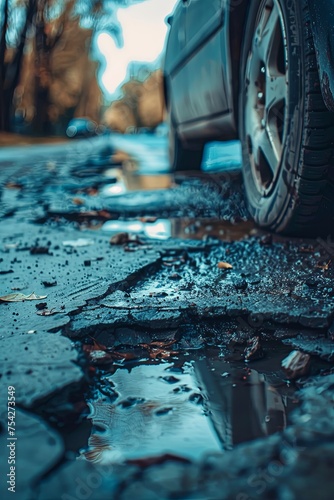 A street with potholes, a hole in the road.. Damaged asphalt. generative ai
