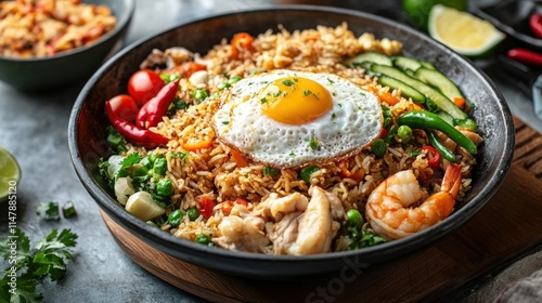 A street-side stall offering nasi goreng (fried rice) cooked in a large wok