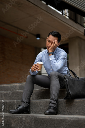 A stressed Asian businessman, appearing tired and unhappy, sits on the steps outside a building.