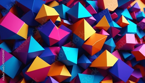 A striking abstract background filled with diverse 3D geometric shapes, showcasing a range of saturated colors for a bold modern art effect, Generative AI