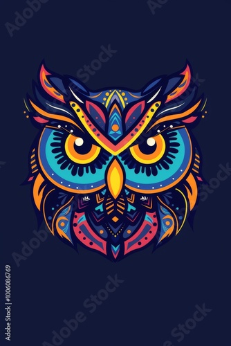A striking and colorful abstract owl illustration featuring intricate patterns and vivid colors against a dark background.