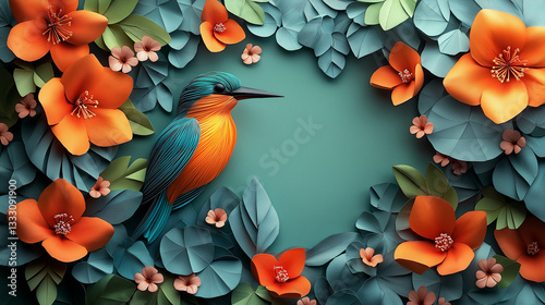 A striking bird with blue and orange feathers sits amid an arrangement of vibrant paper flowers and lush green leaves, showcasing artistic creativity and nature's beauty in a unique setting